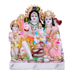 The Shiv Parivar idol showpiece from GW Creations is a breathtaking representation of divine unity, grace, and spiritual strength, meticulously crafted from high-quality marble. Standing at an impressive 7 inches, this exquisite piece is adorned with golden foil work, adding a touch of opulence and elegance to its appearance. Ideal for enhancing the spiritual ambiance of any home or office, the idol beautifully captures the essence of Lord Shiva, Goddess Parvati, and their children, Ganesha and Kartikeya, symbolizing harmony and familial devotion. The intricate detailing and glossy finish highlight the exceptional craftsmanship of skilled artisans, making it a cherished centerpiece that embodies both beauty and spiritual significance.