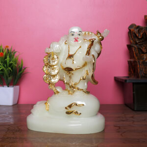 Invite prosperity and happiness into your space with this beautifully crafted Laughing Buddha statue. Featuring a radiant white finish with gold accents, this figurine symbolizes fortune and success. The detailed design includes wealth symbols such as gold coins and a sack of treasures, making it a perfect addition to any home, office, or meditation space. The light enhances its charm, creating a peaceful ambiance.